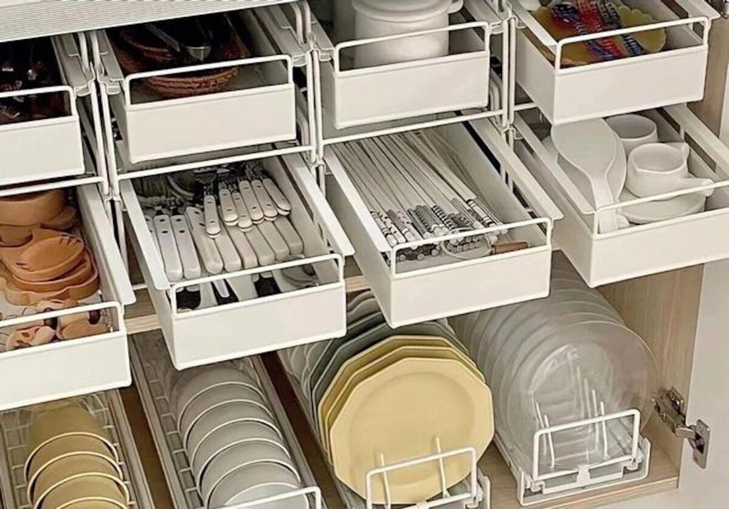 Ví dụ, trong bếp có thể chia tủ treo tường thành các ngăn riêng: tủ đựng bát đĩa dự phòng, tủ để đồ gia dụng nhỏ, ngăn kéo đựng thìa đũa, ngăn khác để túi nilon hoặc hộp nhựa.