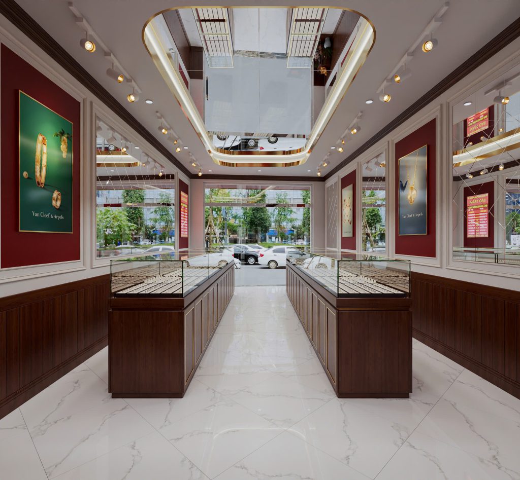 Ánh sáng: Hệ thống đèn track light (đèn rọi) tập trung thẳng vào các khay trang sức là kỹ thuật chuẩn để làm tôn lên độ sáng bóng và sắc sảo của sản phẩm.