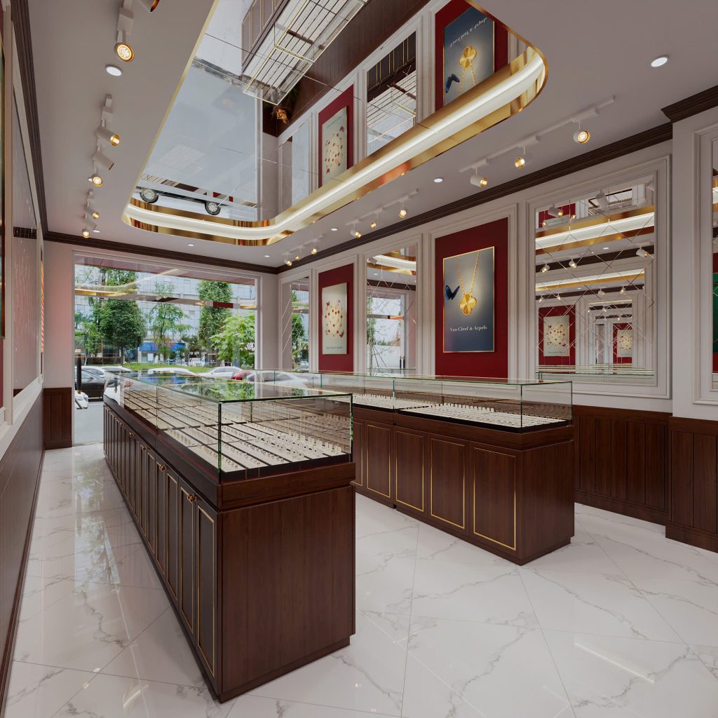 Ánh sáng: Hệ thống đèn track light (đèn rọi) tập trung thẳng vào các khay trang sức là kỹ thuật chuẩn để làm tôn lên độ sáng bóng và sắc sảo của sản phẩm.