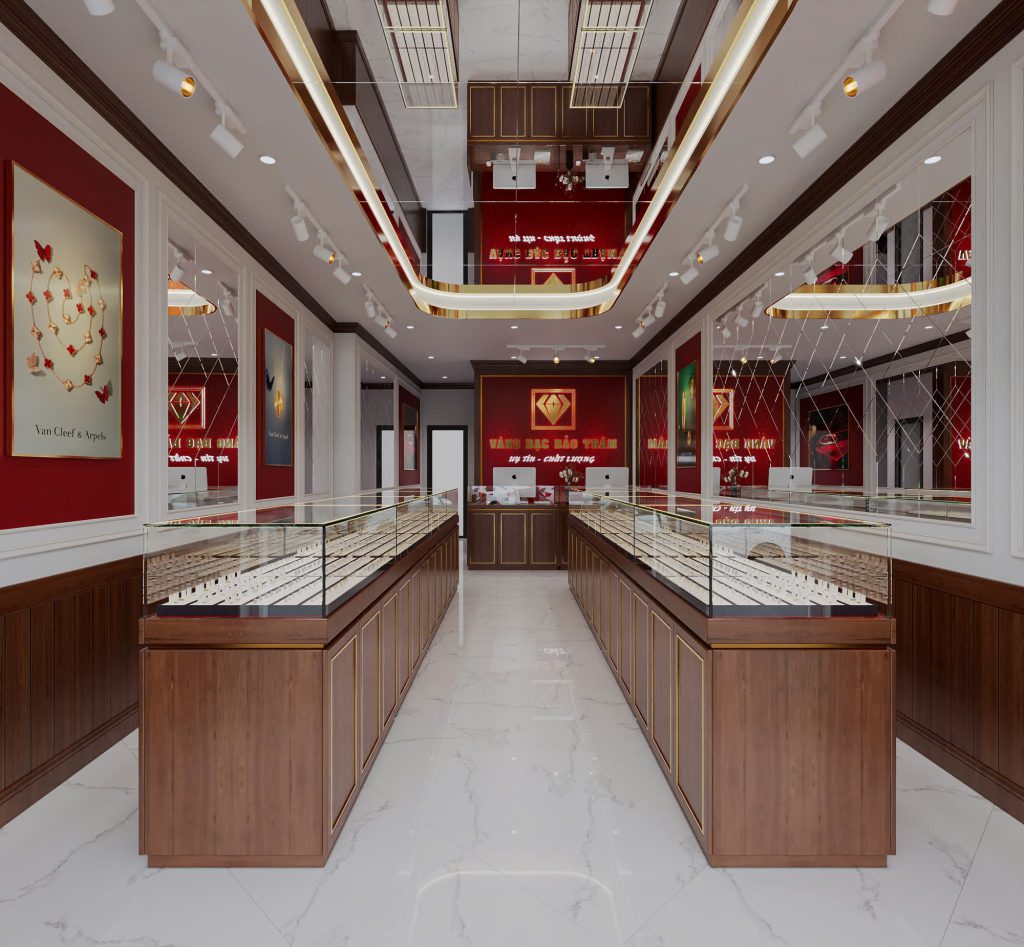 Phối màu phong thủy: Việc sử dụng tông màu Đỏ – Vàng kim là một lựa chọn “kinh điển” cho các tiệm vàng. Nó không chỉ tượng trưng cho sự may mắn, tài lộc mà còn tạo cảm giác tin cậy, ấm cúng.