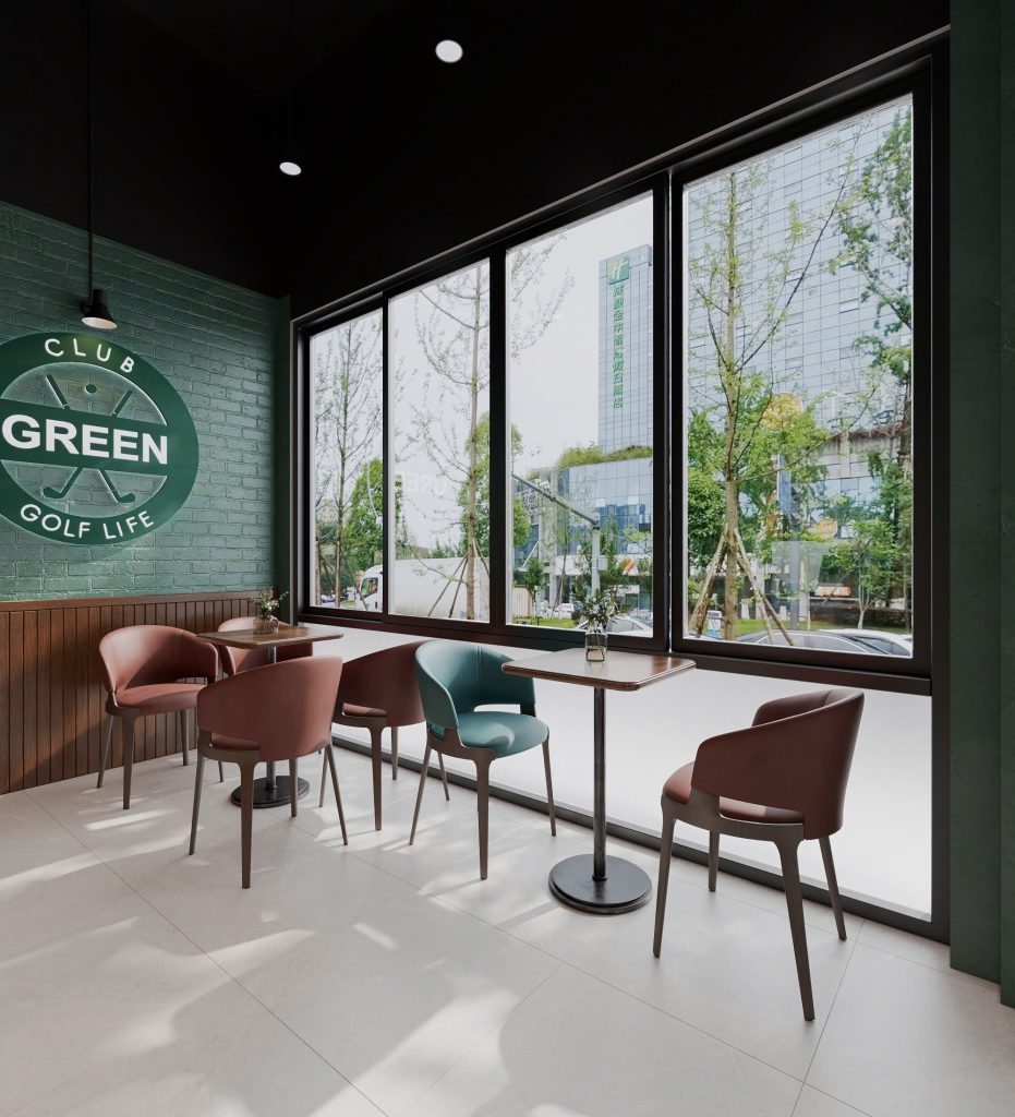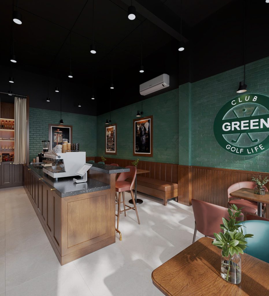 Chúng tôi sử dụng màu xanh rêu đậm (Deep Green) làm màu chủ đạo cho các mảng tường gạch thô, gợi nhớ đến những thảm cỏ xanh mướt của bộ môn Golf – đúng như tên gọi của quán. Kết hợp với đó là trần nhà được sơn đen hoàn toàn, bao gồm cả hệ thống đường ống kỹ thuật, giúp tạo độ sâu cho không gian và làm nổi bật hệ thống ánh sáng.