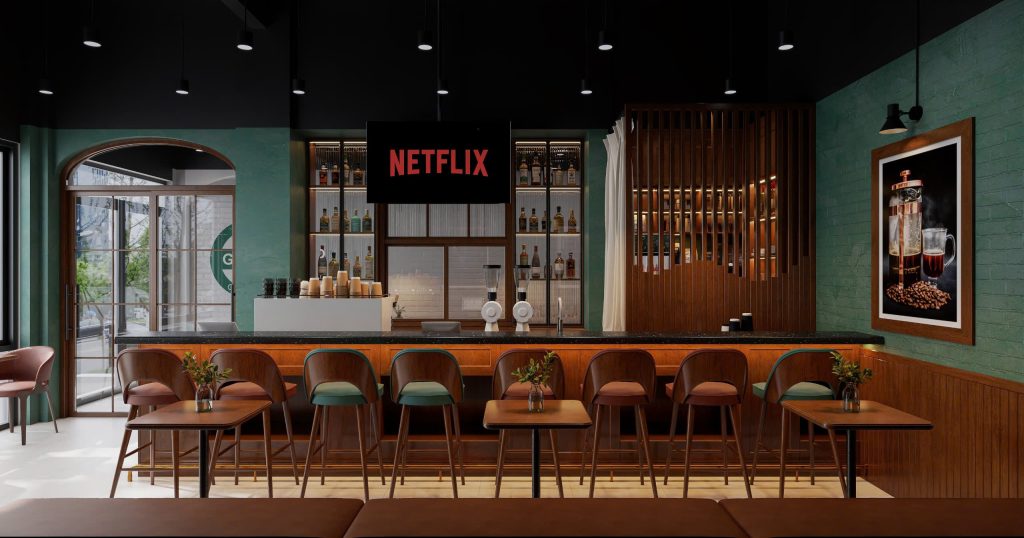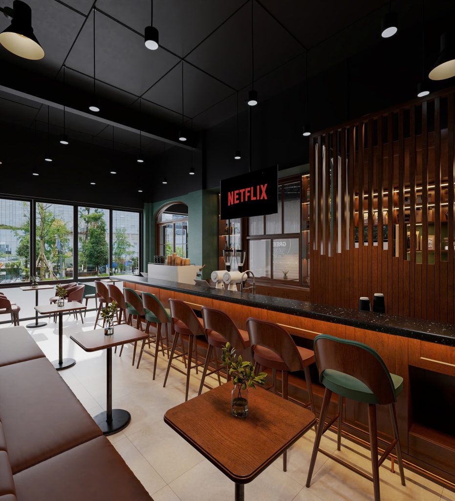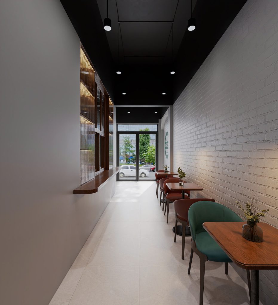 Trên hồ sơ thiết kế và phối cảnh 3D thực tế, không gian quán được Matrix Design & Build xử lý khéo léo với các điểm nhấn sau: